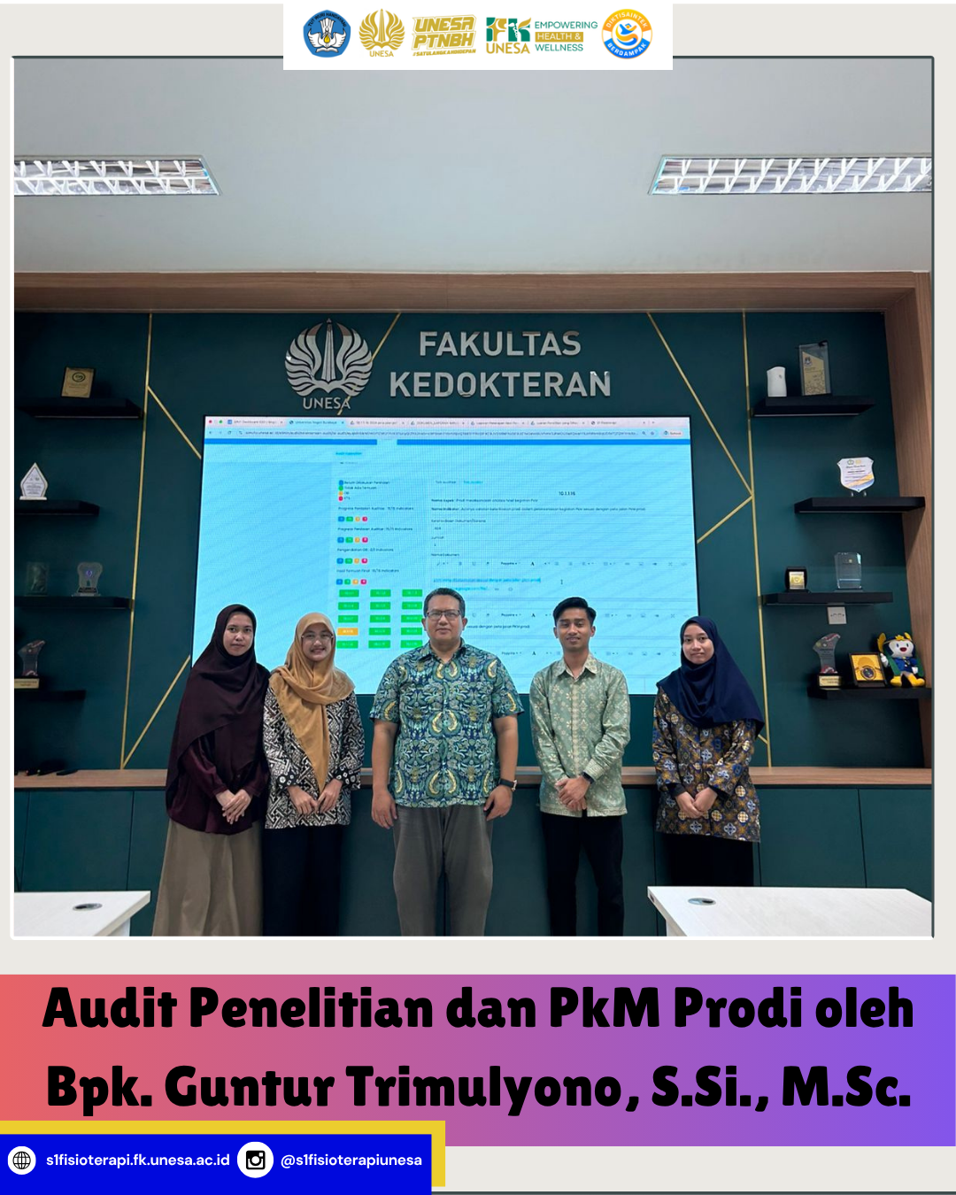 Prodi S1 Fisioterapi Fakultas Kedokteran Universitas Negeri Surabaya (Unesa) melaksanakan kegiatan Audit Penelitian dan Pengabdian kepada Masyarakat (PkM) sebagai bagian dari upaya peningkatan mutu akademik dan tata